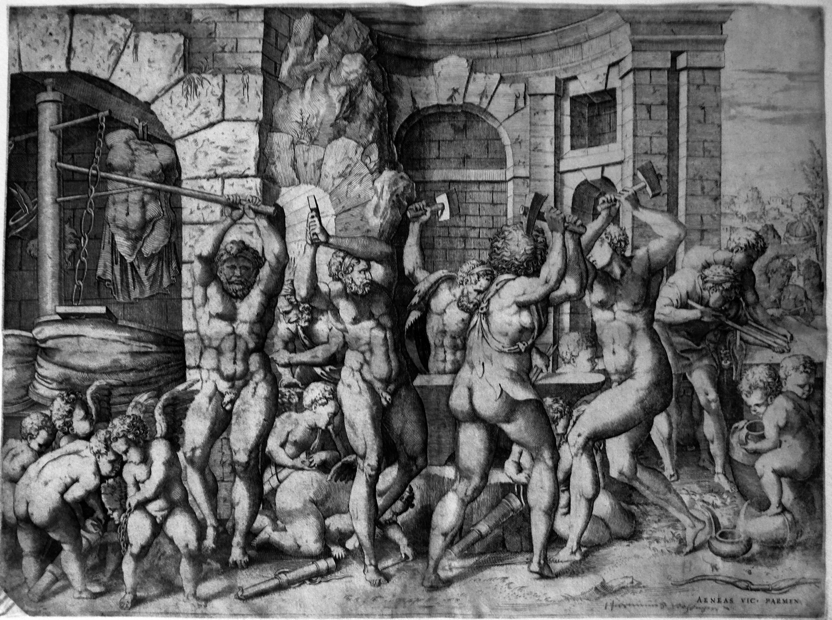 L’immagine raffigura la fucina di Vulcano in cui più Ciclopi sono intenti a preparare dardi e catene, mentre la figura centrale sta muovendo il mantice. Tutt’ intorno i putti alati che rimandano al mito di Venere e Cupido. Nella fucina di Vulcano vengono infatti forgiate le frecce per l’arco di Cupido.