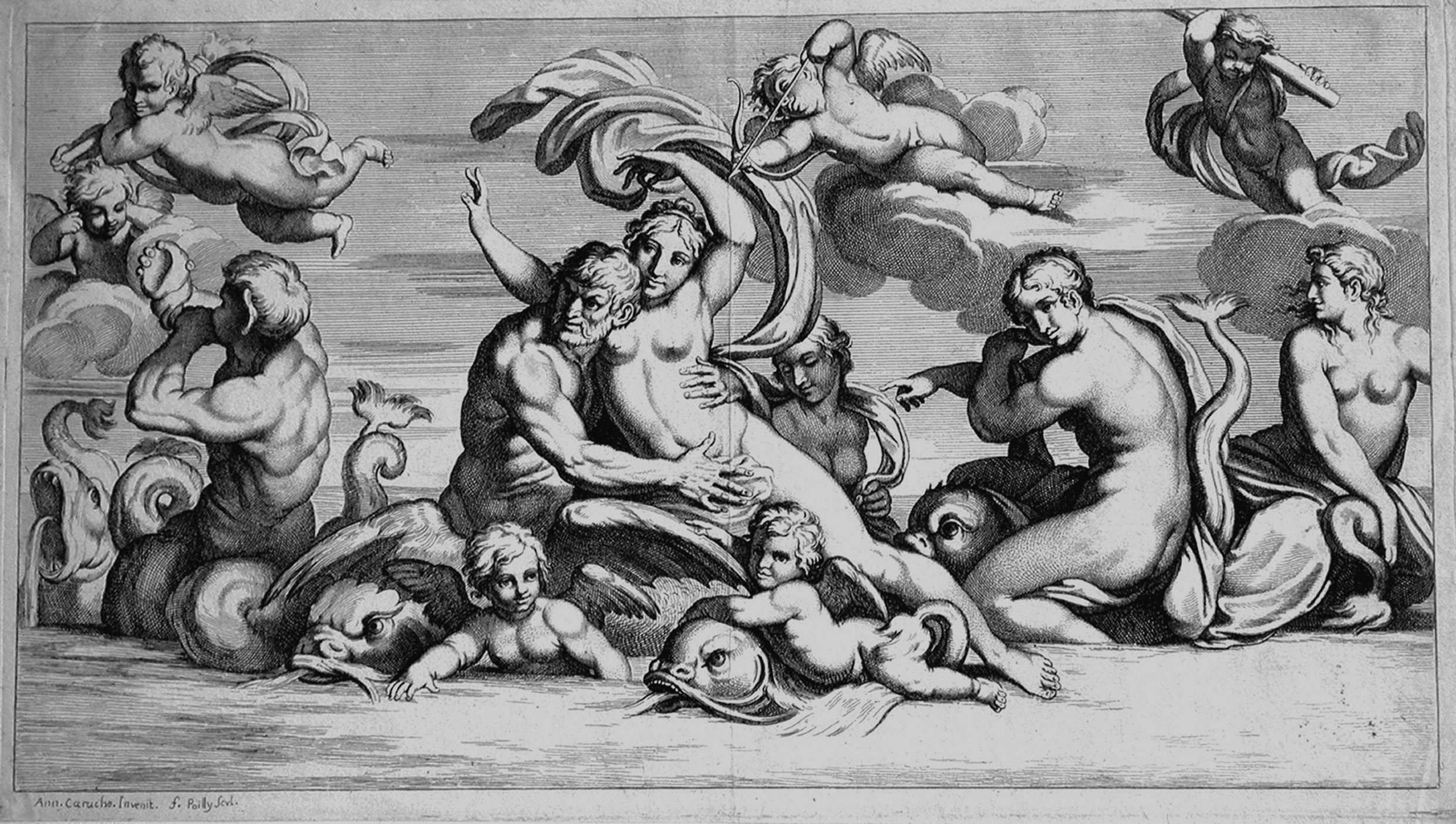 La stampa fa parte di un’ampia serie, eseguita in collaborazione con il nipote Jean Baptiste, in cui sono riprodotti gli affreschi dipinti da Annibale Carracci, con l’aiuto del fratello Agostino, alla Galleria Farnese.